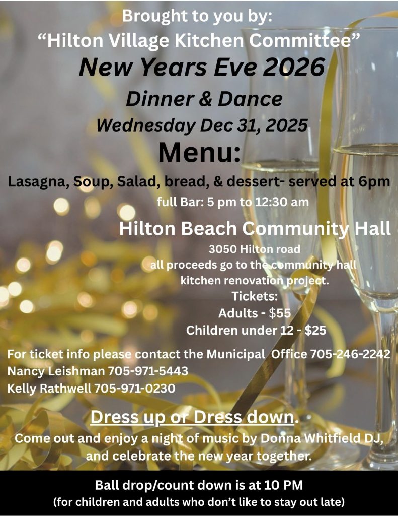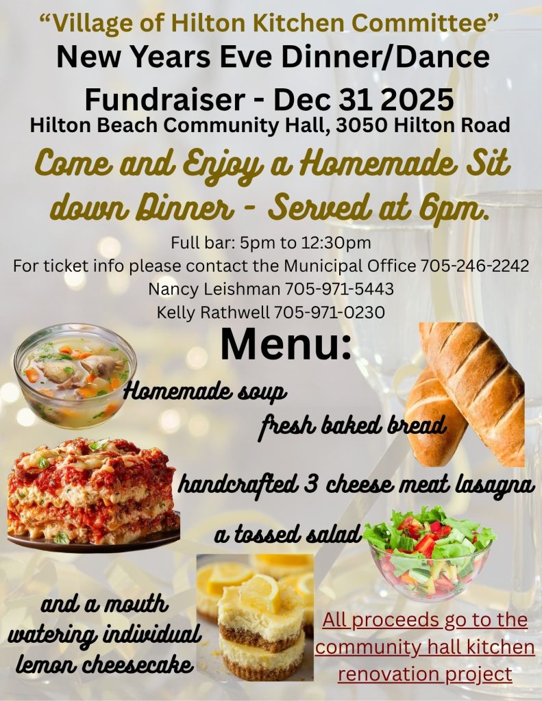 Home Events Hilton Beach Kitchen Upgrade Committee – New Years Party! in Family Events, Food & Fundraisers Date December 31, 2025 Time 5:00 pm Hilton Beach Community Hall 3050 Hilton Road, Hilton Beach Event location