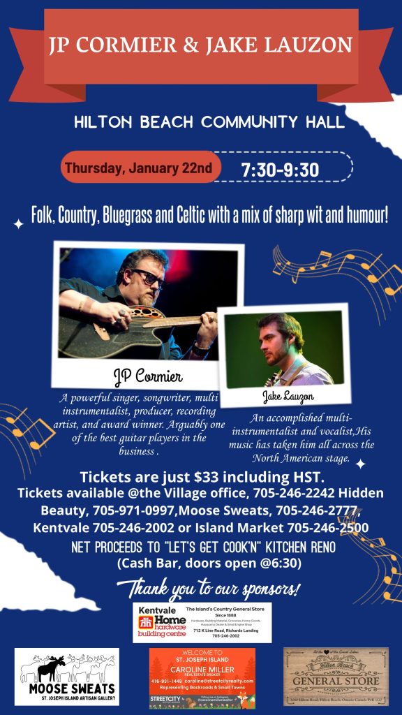 Home Events JP Cormier & Jake Lauzon Concert in Arts & Entertainment Date January 22, 2026 Time 7:30 pm - 9:30 pm Hilton Beach Community Hall 3050 Hilton Road, Hilton Beach Event location